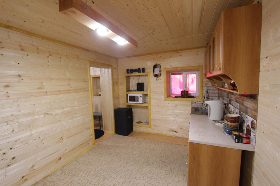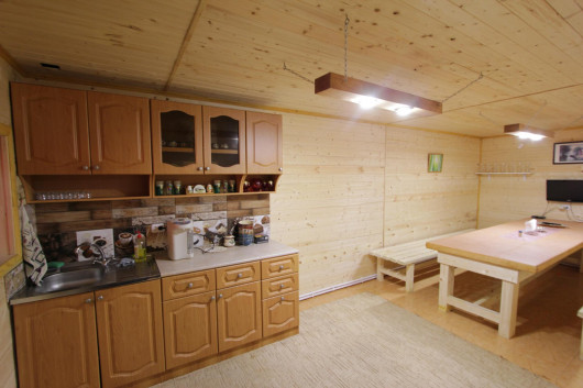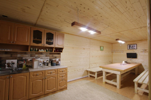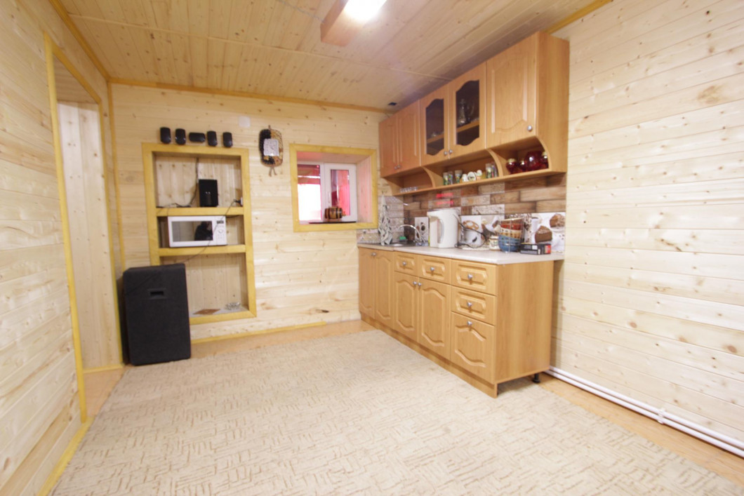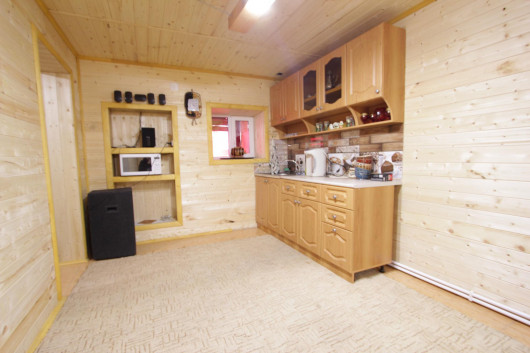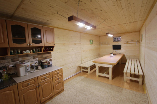 Банный комплекс оснащен кухней, в которой есть стол на 13 персон, кухонный гарнитур.